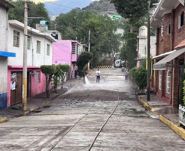 Elementos del Grupo Tláloc y la Brigada de Agua retiraron en la calle Geraldine de Cañada de San Andrés, cerca de 154 metros cúbicos de lodo y tierra; además del sondeo de las líneas de drenaje con equipo hidroneumático y el saneamiento de calles y banquetas, con el apoyo de una retroexcavadora, un vactor, un camión de volteo y una pipa.
