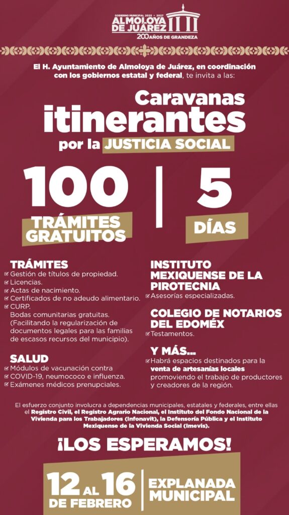 Con el objetivo de evitar largos traslados a la capital mexiquense y acercar servicios esenciales a toda la población, el Ayuntamiento de Almoloya de Juárez, en coordinación con los gobiernos estatal y federal, realizará las Caravanas Itinerantes por la Justicia Social del 12 al 16 de febrero próximo, en la explanada de la cabecera municipal.