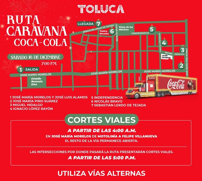 El gobierno municipal de Toluca informa que debido a la Caravana Navideña Coca-Cola 2023 que regresa a la ciudad, y que se llevará a cabo el sábado 16 de diciembre, habrá cierre parcial y total de avenidas y calles, a partir de las 4:00 horas, por lo que recomienda tomar vías alternas.