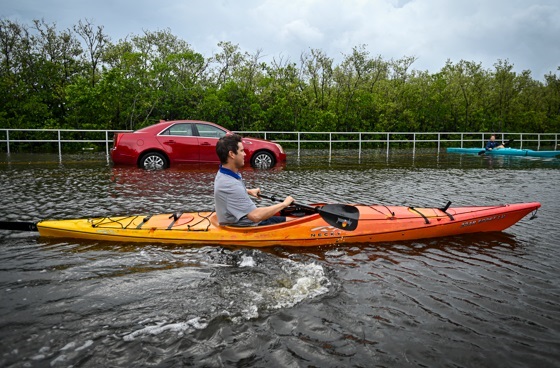 TOPSHOT – Residents use kayaks to travel on a flooded road in Tampa, Florida, on August 30, 2023, after Hurricane Idalia made landfall. Idalia barreled into the northwest Florida coast as a powerful Category 3 hurricane on Wednesday morning, the US National Hurricane Center said. «Extremely dangerous Category 3 Hurricane #Idalia makes landfall in the Florida Big Bend,» it posted on X, formerly known as Twitter, adding that Idalia was causing «catastrophic storm surge and damaging winds.» (Photo by Miguel J. Rodriguez Carrillo / AFP)