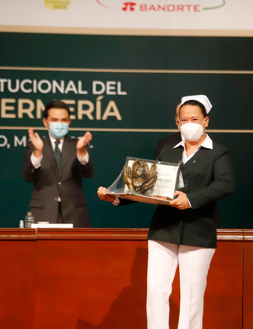 Como parte de la ceremonia institucional por el Día de la Enfermería, se entregó el Premio “Jesús Kumate Rodríguez” a Líderes de Equipos COVID: Ana Karina González Ruiz, subjefe de enfermería del Hospital General Regional (HGR) No. 110 de Jalisco, debido a su destacado profesionalismo, compromiso y liderazgo durante la pandemia.