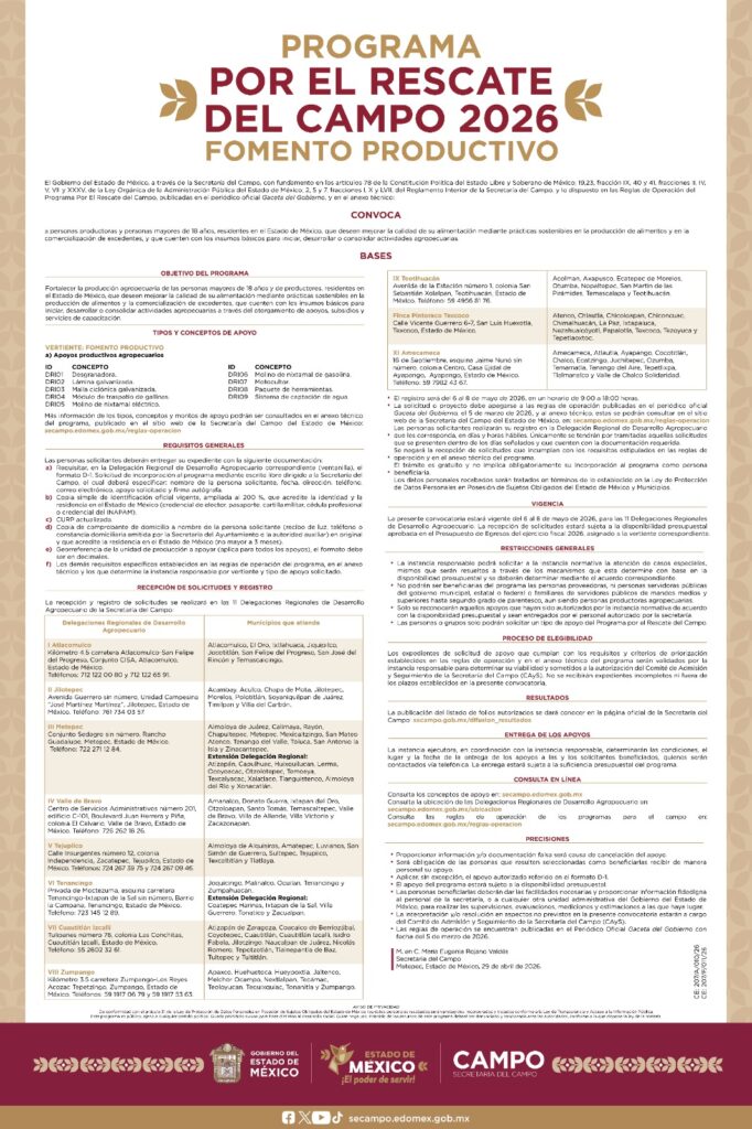 Los días 6, 7 y 8 de mayo de 2026, las 11 Delegaciones Regionales de la Secretaría del Campo del Gobierno del Estado de México, recibirán las solicitudes de inscripción a los programas Transformando el Campo y Por el Rescate del Campo, con apoyos que van desde implementos y herramientas para pequeñas unidades de producción, hasta subsidios para la adquisición de ganado, drones y tractores.