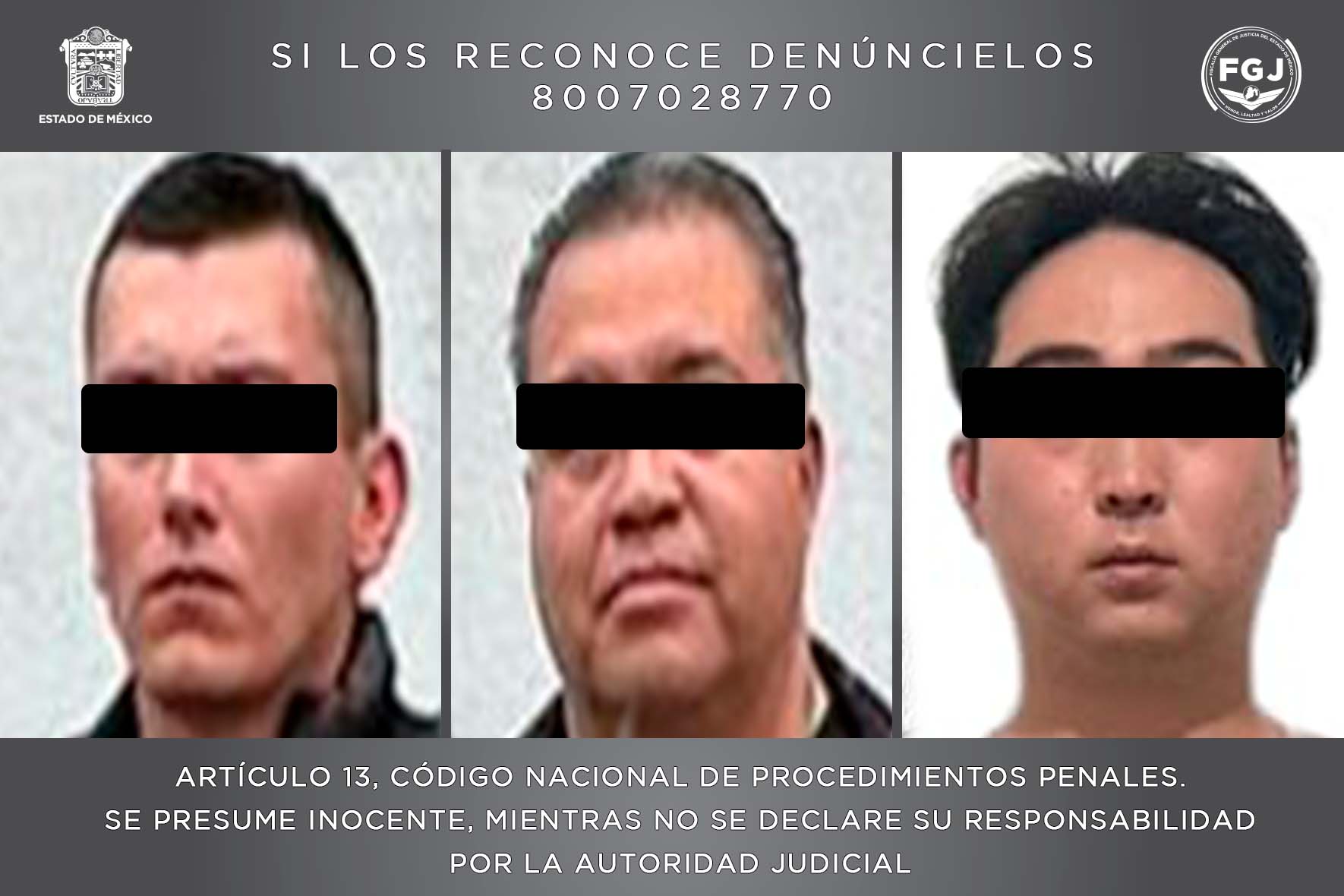 Con estos datos de prueba se solicitó a la Autoridad Judicial librar orden de aprehensión en contra de estos tres posibles implicados, mandamiento judicial que fue otorgado y cumplimentado como resultado de acciones operativas conjuntas de la Fiscalía del Estado de México, con la SSPC, a través de la CONAHO, la Policía Ministerial Militar de la SEDENA, así como la SSC CDMX y la Fiscalía capitalina, quienes ubicaron y detuvieron en la Ciudad de México a Dongwon “N”, Julio César “N” y Carlos “N”.