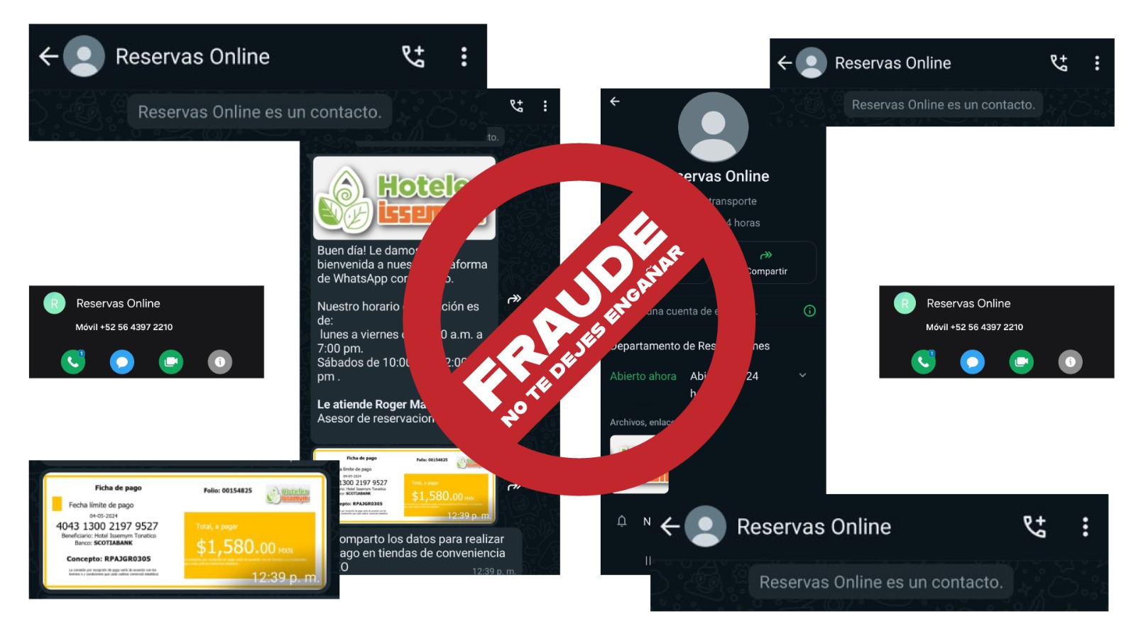 Posteriormente solicitan al interesado efectuar un depósito o transferencia bancaria a través de una ficha “falsa”, la cual previamente le fue enviada por la aplicación de mensajería electrónica WhatsApp, desde varios números, principalmente identificado con el +52 56-4397-2210 denominados “Reservas On-line”, los cuales son apócrifos.