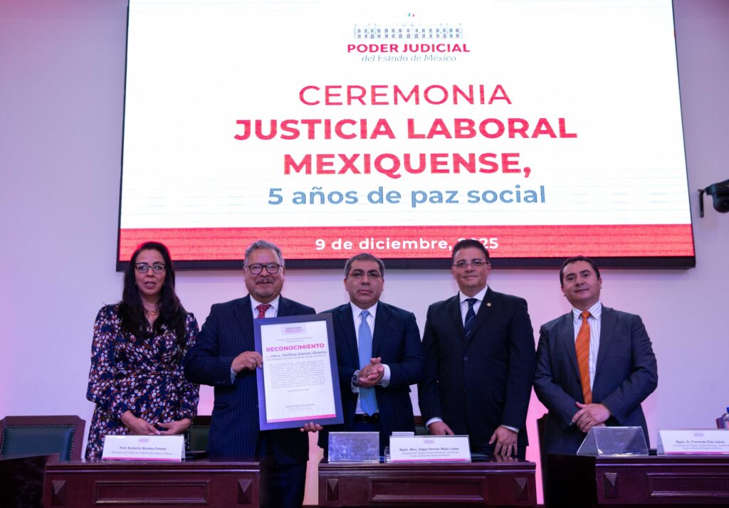 A cinco años de que inició operaciones el modelo de justicia laboral en el Estado de México, la entidad mantiene un dato que habla por sí solo: ni una sola huelga registrada en todo el periodo, así lo destacó el Magistrado Edgar Hernán Mejía López, integrante del Órgano de Administración Judicial, durante la ceremonia “Justicia Laboral Mexiquense: cinco años de paz social” y en representación del Magistrado Héctor Macedo García, Presidente del Tribunal Superior de Justicia.