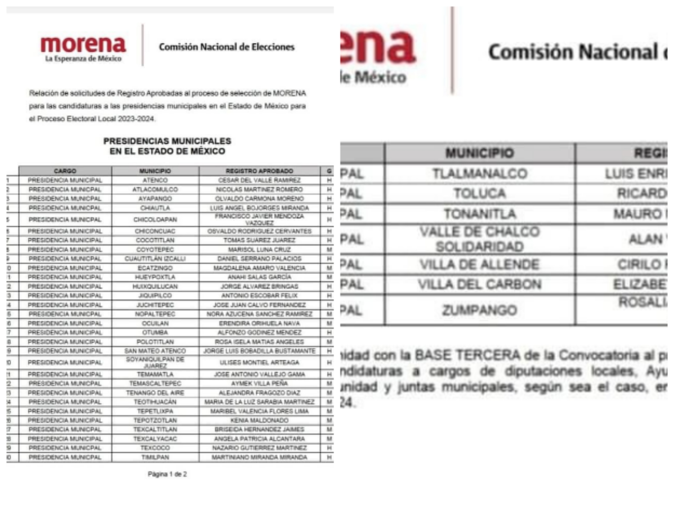 Entre las designaciones en Morena destacan: Daniel Serrano, en Cuautitlán Izcalli; Nazario Gutiérrez, en Texcoco; Atlacomulco, Nicolás Martínez; Huixquilucan, Jorge Álvarez Bringas; San Mateo Atenco, Jorge Luis Bobadilla; Ocuilan, Eréndira Orihuela.