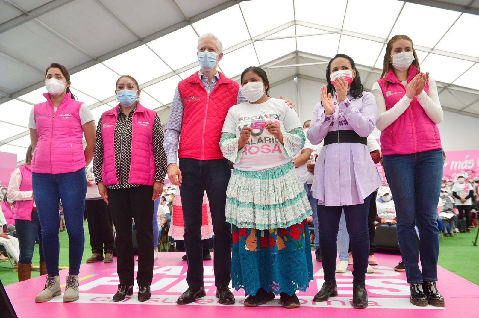 “Seguimos avanzando, poco a poco vamos avanzando, hoy, aquí, van a recibir el Salario rosa más de 3 mil 600 mujeres de esta región del Estado de México, pero en total ya estamos llegando a 554 mil mujeres de los 125 municipios del Estado de México que reciben su Salario rosa y que se convierte en un ingreso para su familia”, afirmó.