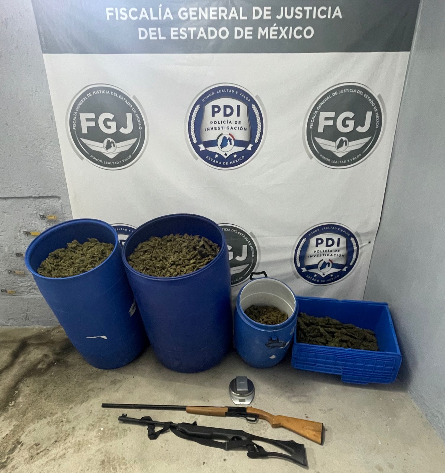 Este mandamiento judicial fue otorgado, por ello elementos de la Fiscalía mexiquense y de la Policía Municipal se trasladaron al lugar, donde hallaron y aseguraron recipientes y cajas con un total de 90 kilogramos de hierba verde con las características de la marihuana, dos armas tipo escopeta, una caja fuerte y básculas.