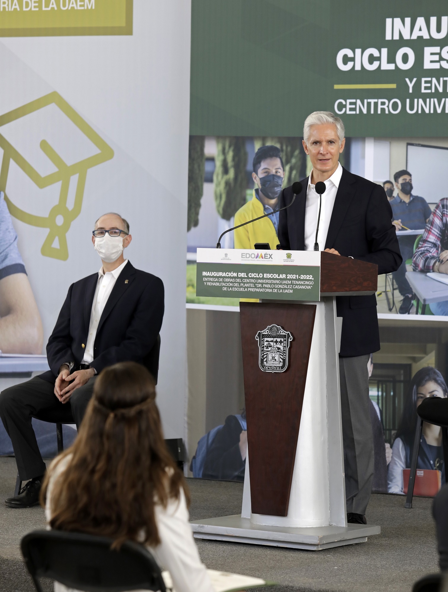 En el Plantel «Dr. Pablo González Casanova» de la  Escuela Preparatoria de la UAEM, el Gobernador del Edoméx subrayó las acciones que implementa la máxima casa de estudios del estado para salvaguardar la salud de su comunidad, entre ellas la vacunación de la mayoría del personal académico y docente, asistencia presencial voluntaria, las aulas, las prácticas, así como las actividades de investigación, deportivas y culturales, se llevarán a cabo de manera escalonada, con un aforo máximo del 50 por ciento, y el acceso a los espacios universitarios es permitido solamente a aquellas personas que cumplan con el protocolo sanitario.