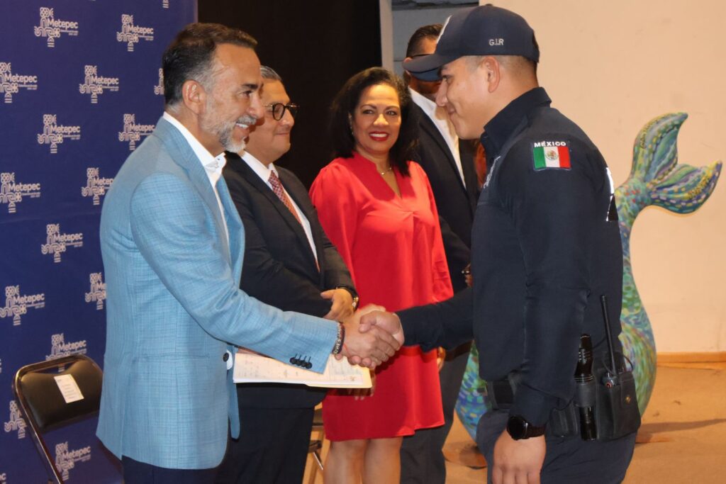 Fernando Flores Fernández, presidente municipal de Metepec 126 elementos de la Corporación de Policía de Metepec fueron reconocidos por su destacado desempeño en las labores de salvaguarda y protección de la ciudadanía.En el evento estuvieron presentes integrantes del Cabildo, mandos de seguridad y familiares de los uniformados, quienes atestiguaron la entrega de estímulos económicos a los agentes, como parte de una política municipal para incentivar el compromiso, la eficiencia y el profesionalismo en la corporación.El alcalde destacó la labor de los policías, subrayando su entrega diaria en favor de la seguridad de las familias metepequenses, “agradezco profundamente su gallardía, honor y valor. Gracias por no rendirse y por hacer de esta corporación un ejemplo de servicio y responsabilidad”.Flores Fernández, reiteró que la administración municipal mantiene el compromiso de mejorar las condiciones laborales y personales de los elementos policiales, «en este mismo año se concretará la primera etapa del proyecto de la Ciudad Policial, que contempla la construcción de 50 viviendas destinadas exclusivamente a los agentes de seguridad y sus familias».“Estamos en un Metepec positivo, que construye puentes entre ciudadanos y gobierno, que fortalece su tejido social con acciones concretas y con visión de futuro. Tenemos la determinación de ser el municipio más seguro del país, y lo vamos a lograr trabajando unidos”, subrayó el presidente municipal.Cabe mencionar que el reconocimiento a los 126 elementos forma parte de una estrategia integral que busca dignificar la labor policial y consolidar una cultura de proximidad con la ciudadanía. Se trata de continuar construyendo confianza, reforzando la seguridad desde lo institucional y fortaleciendo el compromiso con la comunidad.