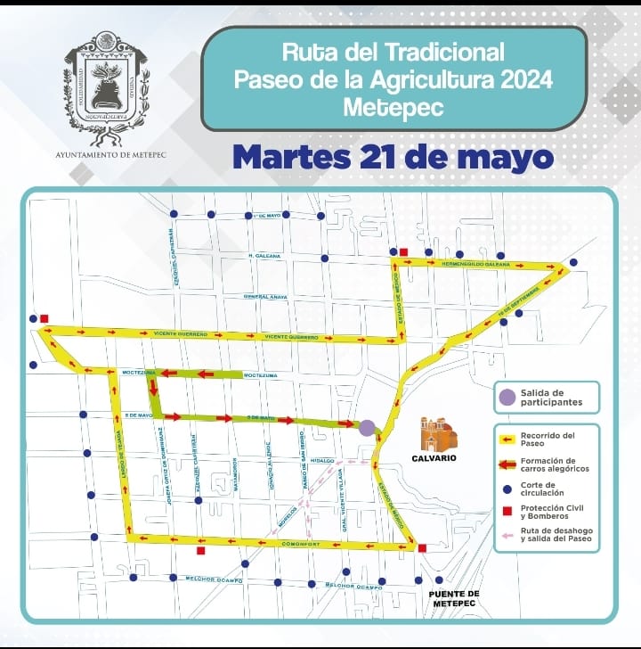 Autoridades del Ayuntamiento de Metepec informaron que este martes 21 de mayo en Metepec, se llevará a cabo el tradicional ‘Paseo de la Agricultura 2024’ en honor a San Isidro Labrador, por lo que, varias calles estarán cerradas a la circulación vial.