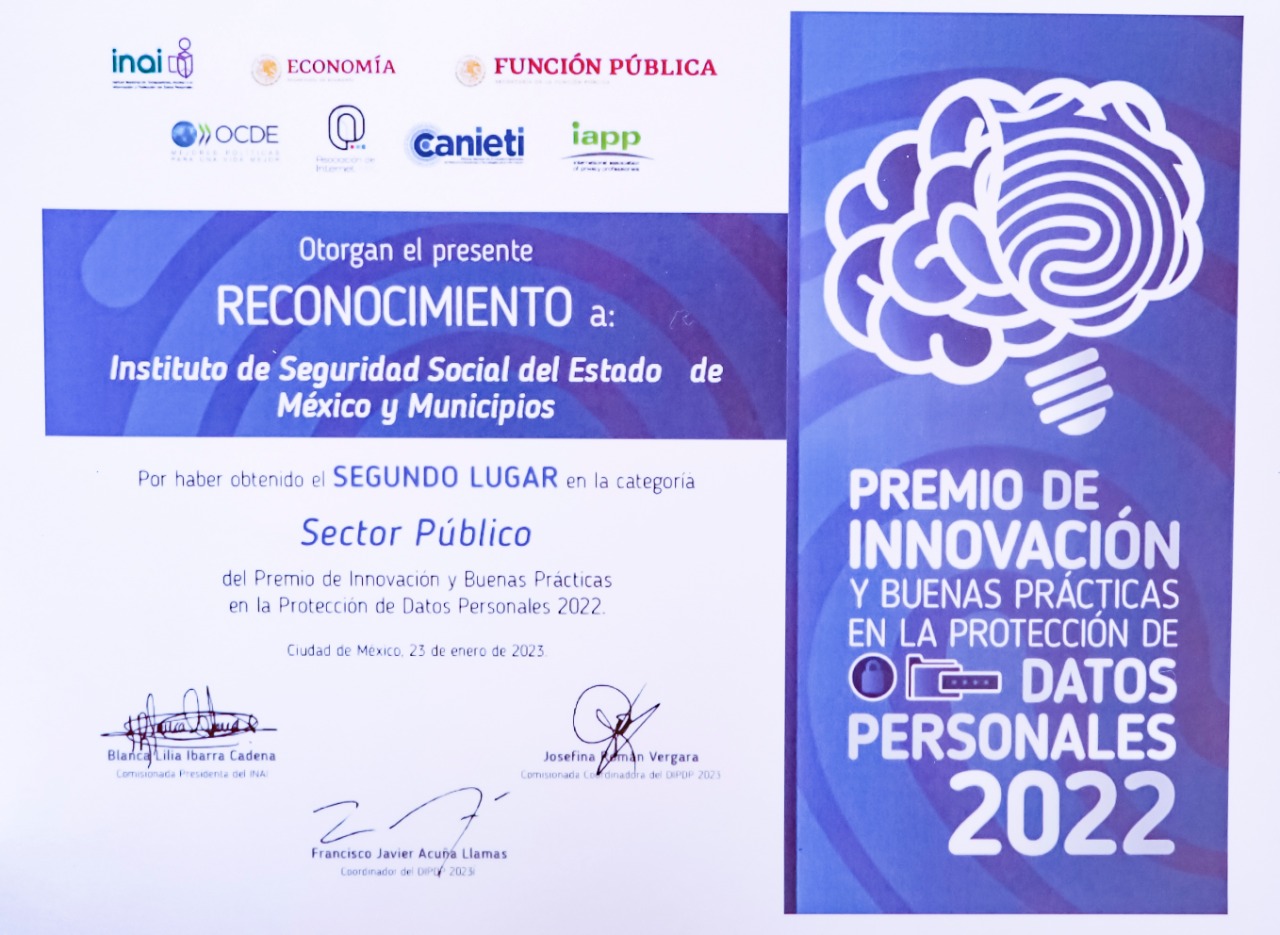 El Instituto de Seguridad Social del Estado de México y Municipios (ISSEMyM), obtuvo el segundo lugar nacional en la categoría Sector Público, del concurso Premio de Innovación y Buenas Prácticas en la Protección de Datos Personales 2022, gracias al proyecto denominado “Consentimiento Expreso”.Al respecto, el Instituto Nacional de Transparencia, Acceso a la Información y Protección de Datos Personales (INAI), la Secretaría de Economía (SE), la Secretaría de la Función Pública (SFP), la Organización para la Cooperación y el Desarrollo Económico (OCDE), la Asociación Mexicana de Internet, AC (AIMX), la Cámara Nacional de la Industria Electrónica de Telecomunicaciones y Tecnologías de la Información (CANIETI) y la Asociación Internacional de Profesionales en Privacidad (IAPP), reconocieron y felicitaron las prácticas de mejoramiento e innovación que el ISSEMyM ha previsto hacia su derechohabiencia.Durante la ceremonia de premiación, Marusia Monserrat Torres Rivera, Jefa del Departamento de Acceso a la Información Institucional del ISSEMyM, y a nombre de José Arturo Lozano Enríquez, Director General de este organismo público descentralizado, agradeció la distinción obtenida en este certamen y señaló que el formato “Consentimento Expreso” facilita y garantiza el buen uso de los datos personales de los derechohabientes.“Con ello logramos establecer los principios y procedimientos necesarios para la simplificación y agilización de gestiones administrativas, como es el caso de trámites de pensión, cobro de seguros, consulta de antecedentes médicos familiares, entre otros, tutelando la protección de la información, posterior al fallecimiento de los usuarios”, refirió.Con la implementación del Formato de Consentimiento Expreso, el Instituto incentiva y fortalece el desarrollo de los derechos de acceso en materia de protección de datos personales en el Estado de México, fomentando las buenas prácticas, medibles y replicables, a través de mecanismos de autorregulación.“Esto se implementó con herramientas y medios con los que ya contábamos, como reformas a manuales y modificaciones al sistema de credencialización, entre otros, logrando hacer factible su implementación y atendiendo a los supuestos de operatividad sin costos adicionales”, agregó.Por tal motivo, y en el marco de este reconocimiento nacional, el ISSEMyM reitera a los servidores públicos del Gobierno mexiquense la trascendencia de tramitar el formato de Consentimiento Expreso, el cual consiste en heredar el acceso a sus datos personales.Al respecto, las autoridades institucionales agregaron que este mecanismo de protección de información garantiza el resguardo de los datos sensibles del derechohabiente, los que serán otorgados sólo a la o las personas designadas oficialmente.Esta alternativa podrá ser solicitada en las unidades y oficinas de atención al derechohabiente, previa cita gestionada vía internet a través del sitio web www.issemym.gob.mx.Por otra parte, también invitaron a los servidores públicos en activo a mantener actualizada su carta testamentaria, la cual tiene como finalidad el pago de un seguro por fallecimiento a la o las personas que hayan sido designadas como beneficiarias por parte del servidor público, por lo que es muy importante actualizarla si es que desea realizar un cambio en el nombramiento de los beneficiarios para el pago, impulsando así la cultura de la prevención.Dichas medidas, agregaron, forman parte de los mecanismos para la protección de datos a los usuarios del ISSEMyM, con el fin de otorgar un acceso ordenado a la información de las personas fallecidas para simplificar los trámites pendientes, además de asegurar que el uso de la información personal quede en manos de las personas autorizadas.