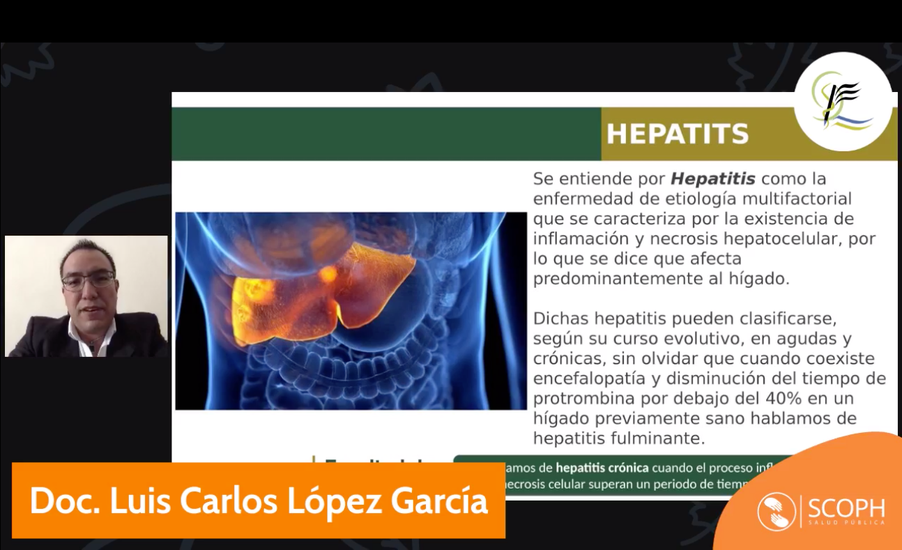Toluca Méx; 29 de agosto de 2022. Durante la charla “Todos contra le hepatitis”, organizada por la Organización Estudiantil en Pro de la Salud (OEPSA) de la UAEMéx, el especialista en salud pública Luis Carlos López García, manifestó que la hepatitis es una enfermedad de biología multifactorial que se caracteriza por la existencia de inflamación y necrosis hepatocelular, por lo que afecta predominantemente al hígado; de acuerdo con su curso evolutivo, éstas pueden ser agudas y crónicas cuando superan un tiempo patológico de seis meses.