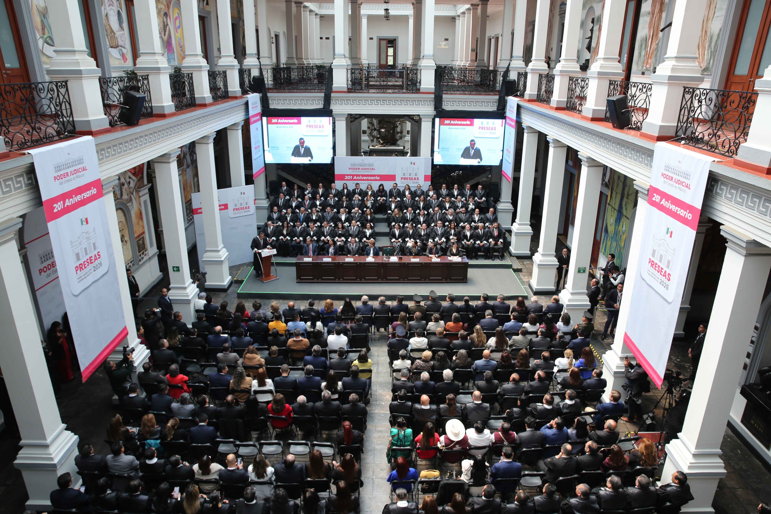 Acompañado por la Gobernadora Delfina Gómez Álvarez -invitada de honor- y en el marco del 201 aniversario del Poder Judicial, el Magistrado Presidente recordó que esta fecha conmemora la instalación del máximo tribunal de la entidad en 1825, cuando, pese a las limitaciones de la época, ya existía entre los mexiquenses un profundo sentido de justicia que dio origen a la institución.