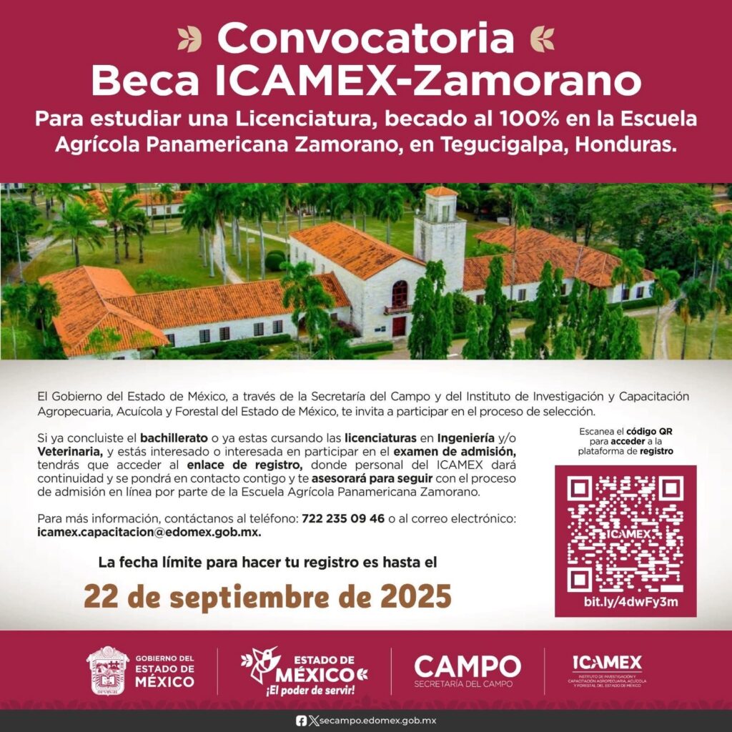 El Gobierno del Estado de México abrió la convocatoria para estudiar en la Escuela Agrícola Panamericana “Zamorano”, en Tegucigalpa, Honduras, a través de una beca con el 100 por ciento de los gastos pagados.