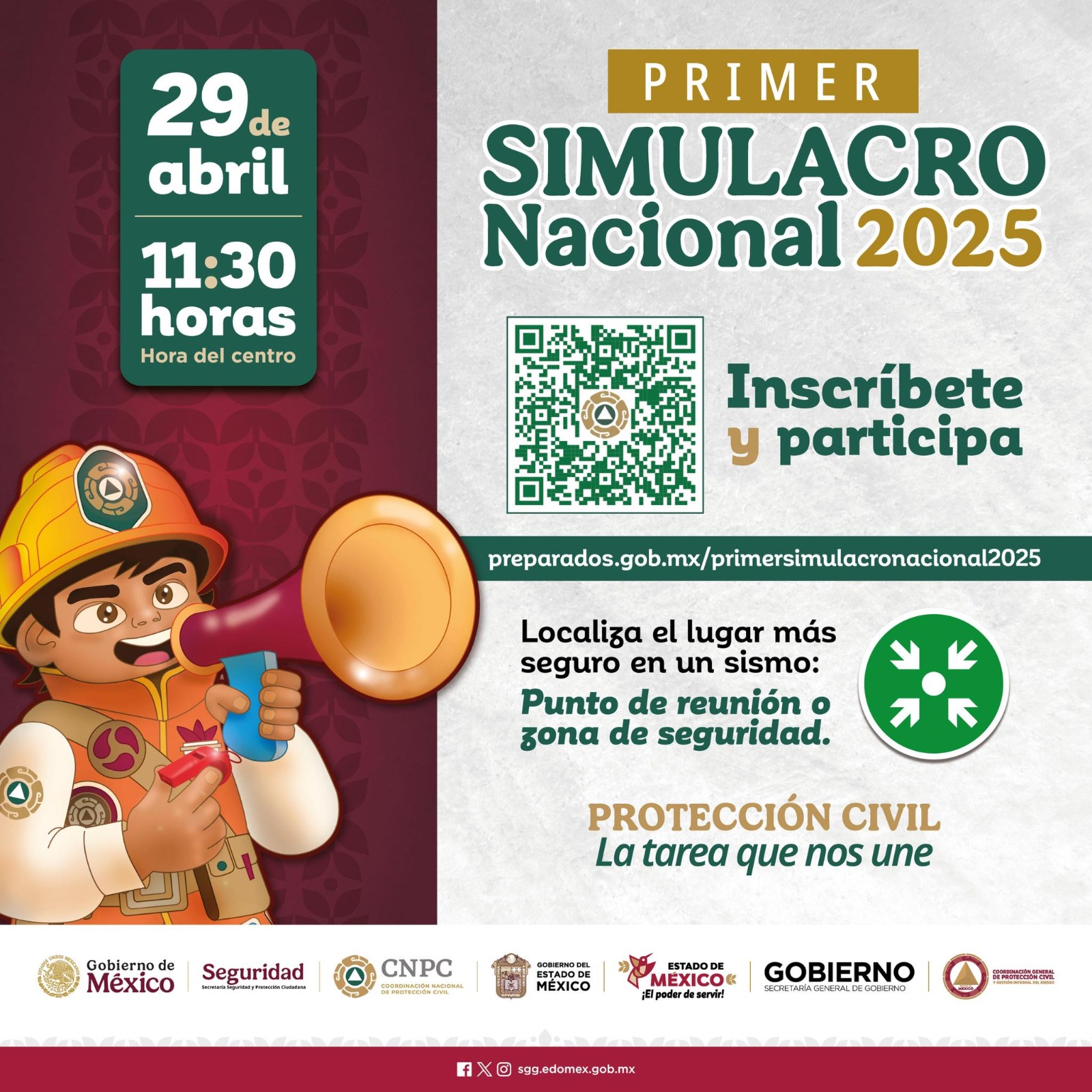 La Secretaría General de Gobierno del Estado de México, a través de Coordinación General de Protección Civil, invita a la población mexiquense a participar en el Simulacro Nacional 2025, que se llevará a cabo el próximo martes 29 de abril a las 11:30 horas.
