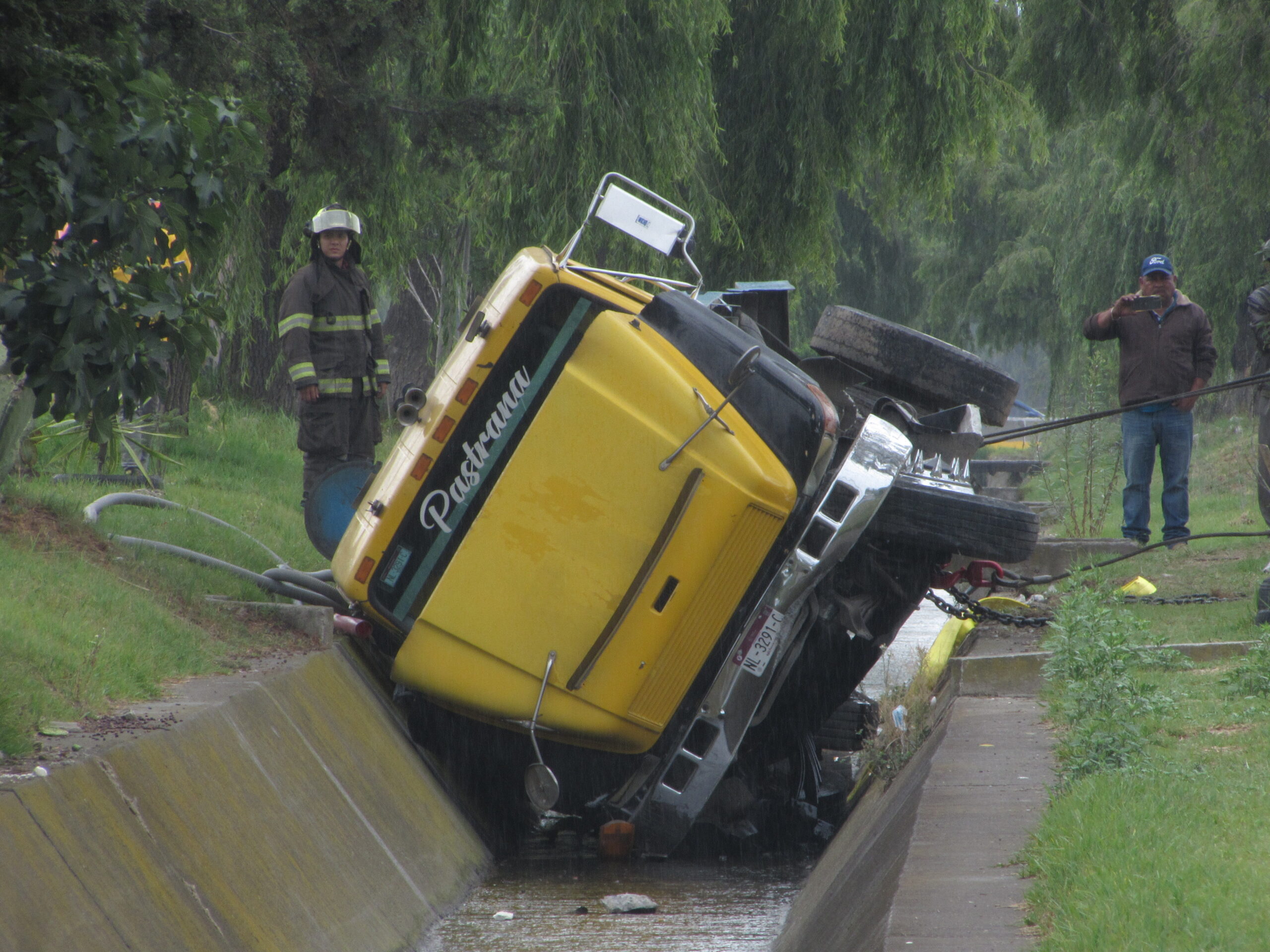 El conductor de una pipa que transportaba agua salió con lesiones leves después de volcar al perder el control al pasar por una coladera en mal estado y salir de la carretera en la delegación de Capultitlán en Toluca.