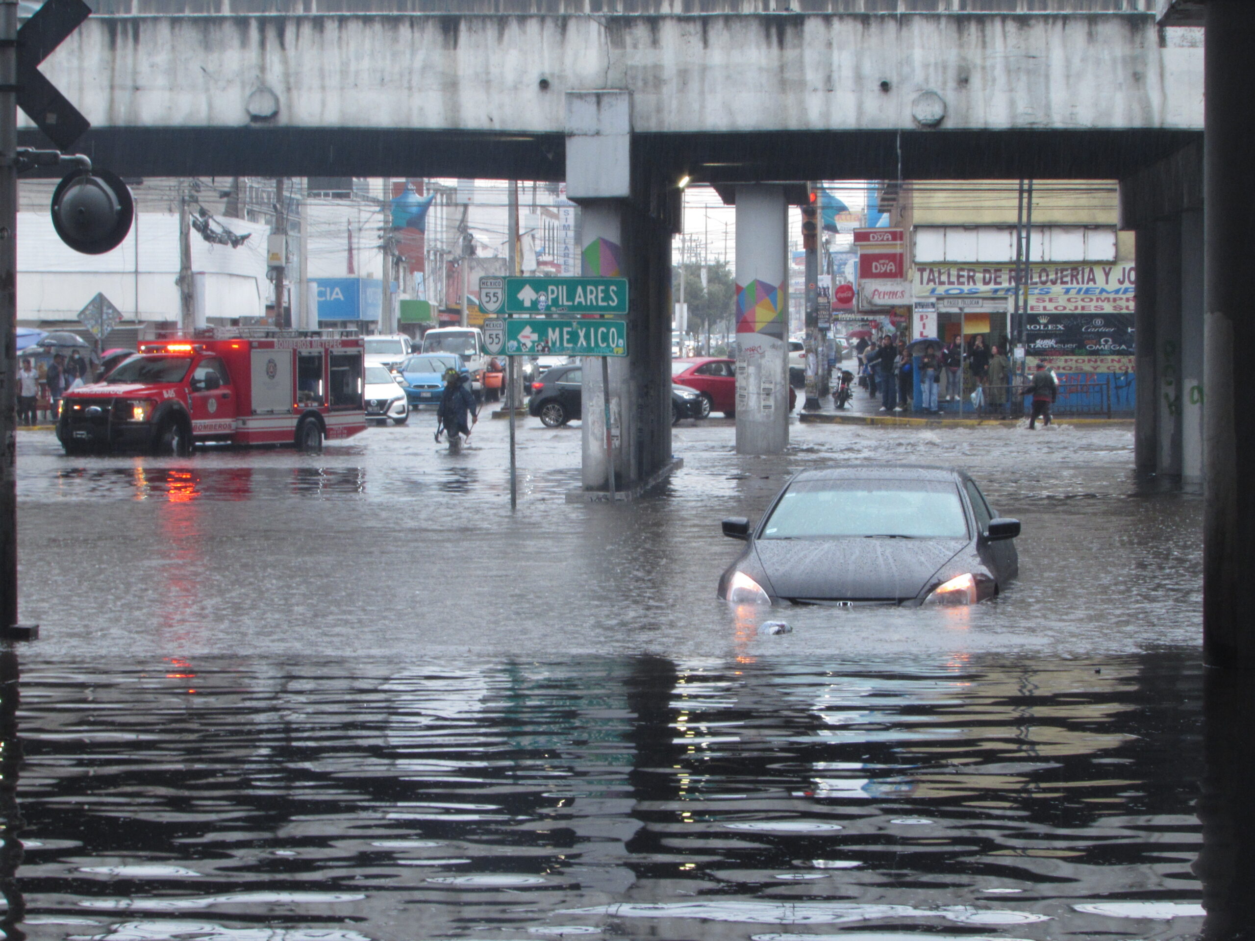 La lluvia que se registró en el Valle de Toluca dejó vehículos atrapados abajo de un puente vehicular ubicado en el municipio de Metepec, donde el nivel del agua alcanzó hasta 70 centímetros de altura en algunos puntos.