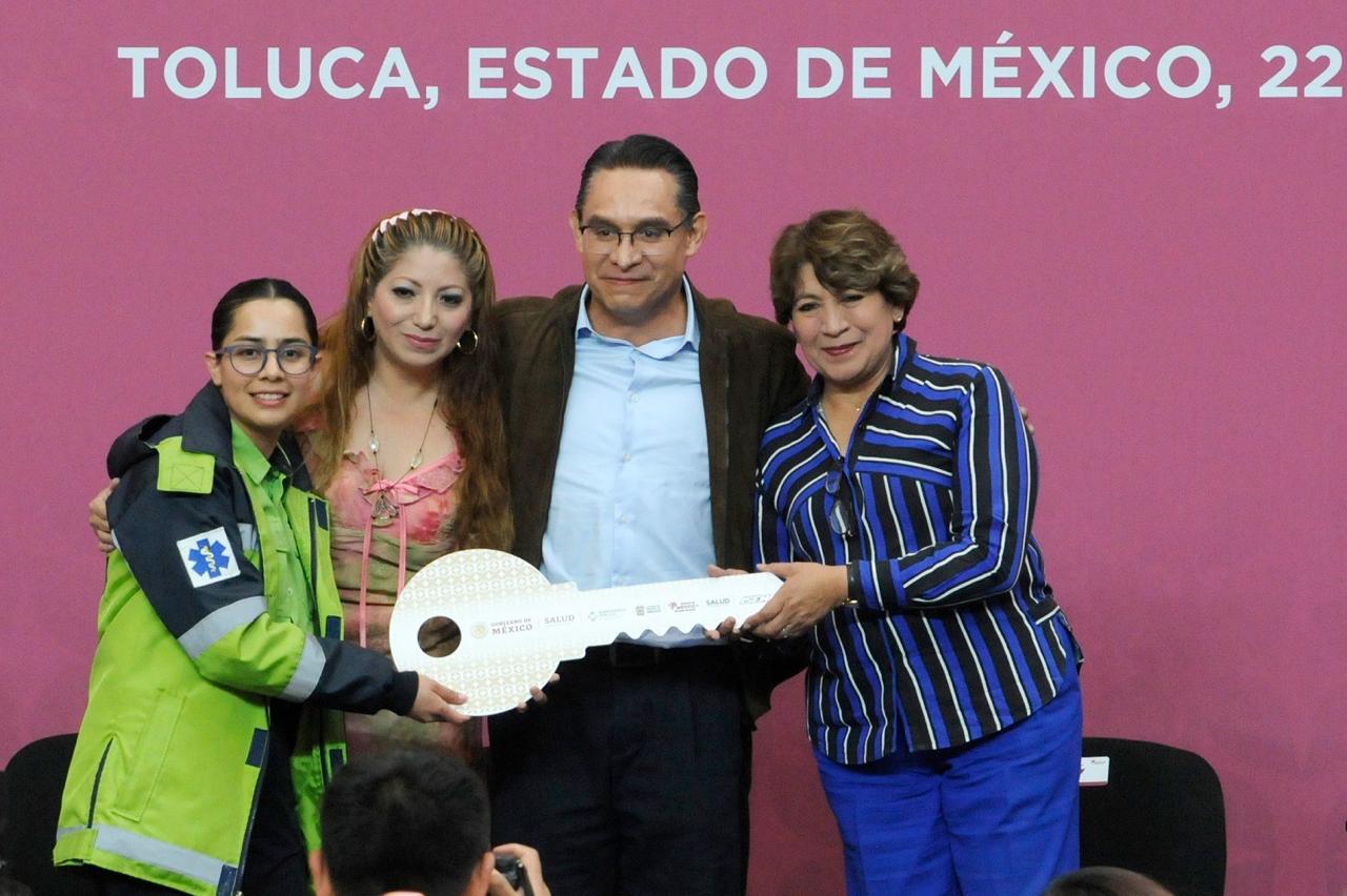 La Gobernadora Delfina Gómez Álvarez encabezó la entrega de 48 ambulancias que la Beneficencia Pública donó al Estado de México, así como cinco mastógrafos digitales, 52 procesadores de implantes cocleares para pacientes con deficiencia auditiva severa y aparatos funcionales, en los cuales se destinaron más de 152 millones de pesos, con el objetivo de cuidar la salud de las y los mexiquenses.