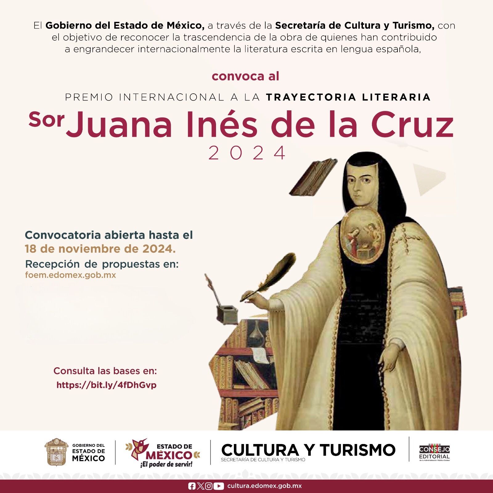 El Gobierno del Estado de México a través de la Secretaría de Cultura y Turismo y el Consejo Editorial de la Administración Pública Estatal (CEAPE), convocan al Premio Internacional a la Trayectoria Literaria “Sor Juana Inés de la Cruz” 2024, con el objetivo de reconocer la trascendencia de la obra de quienes han contribuido a engrandecer internacionalmente la literatura escrita en lengua española.