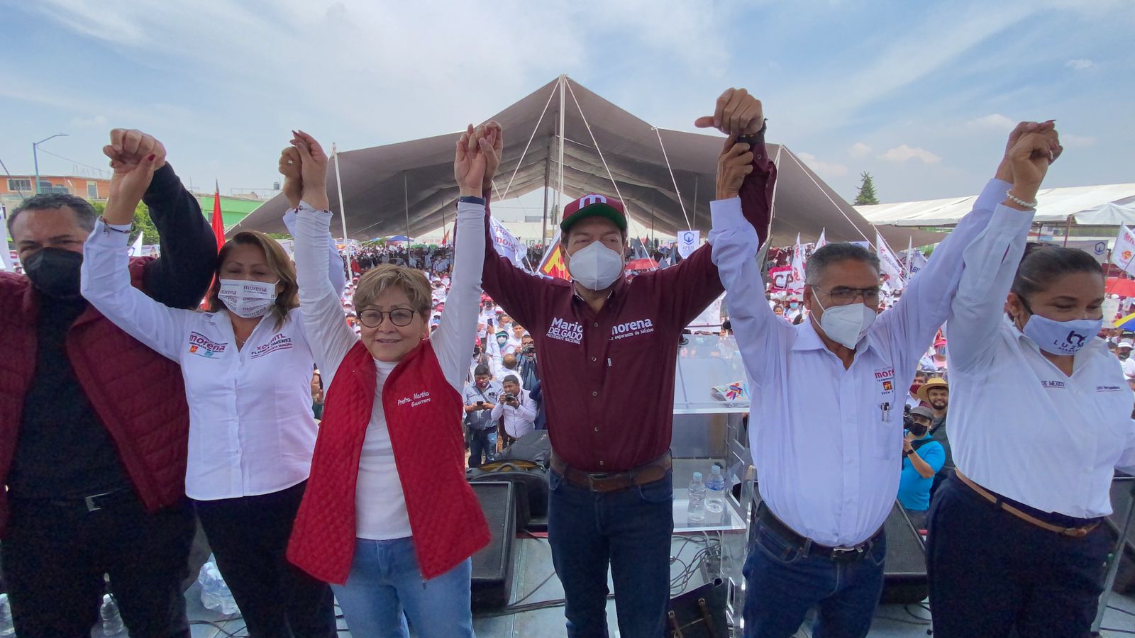Durante el cierre de campaña realizado en el Deportivo Don Bosco, en el Barrio Transportistas, la abanderada de Morena estuvo acompañada por el presidente nacional de Morena, Mario Delgado Carrillo, los senadores, Alejandro Piña y Martha Guerrero, integrantes de su planilla, los candidatos a diputados federales y locales Carlos López Guadarrama, José Luis Montalvo, Adrián Galicia, Nazario Gutiérrez, Emiliano Aguirre, el presidente estatal de Nueva Alianza, Mario Alberto Cervantes Palomino, la diputada Rosa María Pineda, el delegado estatal del CEN, Isaac Montoya, y la secretaria general, Luz María Hernández.