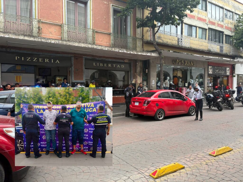 El primer hecho ocurrió en la esquina de las calles Hidalgo y Nicolás Bravo, en pleno centro de la ciudad, donde oficiales detectaron un Chevrolet Beat rojo con placas de la Ciudad de México, relacionado con robos a tiendas Oxxo.