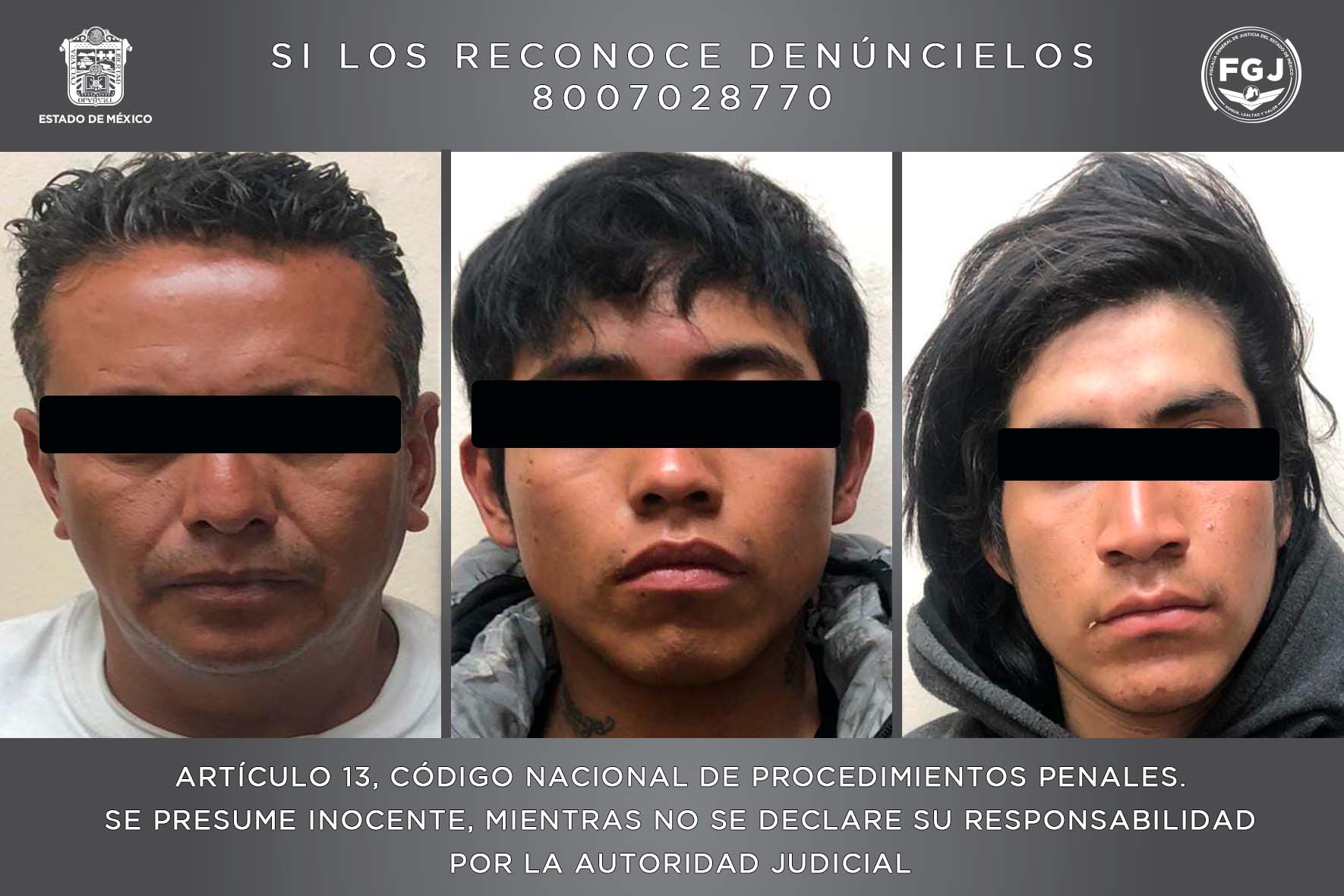 Toluca, Estado de México, 3 de julio de 2023.-La Fiscalía General de Justicia del Estado de México (FGJEM) acreditó la probable intervención de Erik “N”, Alexander “N” y Víctor Fernando “N”, en el hecho delictivo de robo de vehículo con violencia. Los detenidos al parecer son integrantes de un grupo delictivo autodenominado “Los Chatos”, dedicados a esta actividad delictiva en el Valle de Toluca.