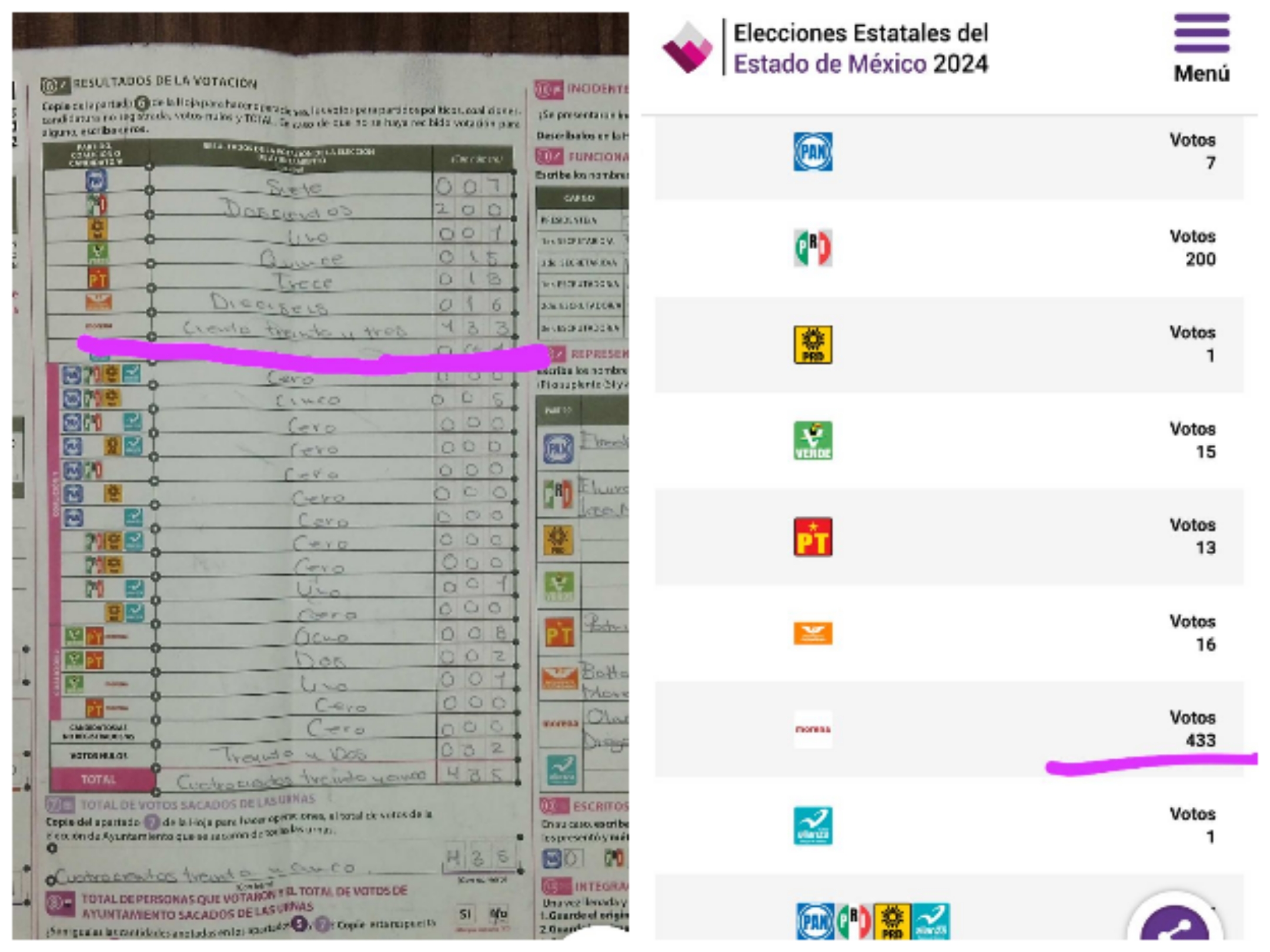 Monroy Esquivel, indicó que un ejemplo claro se presentó en la comunidad de Santa Cruz Mextepec, donde en el acta aparecen 133 votos para Morena y en el PREP aparecen 433, «de ese tamaño son las irregularidades que estamos detectando en la votación».