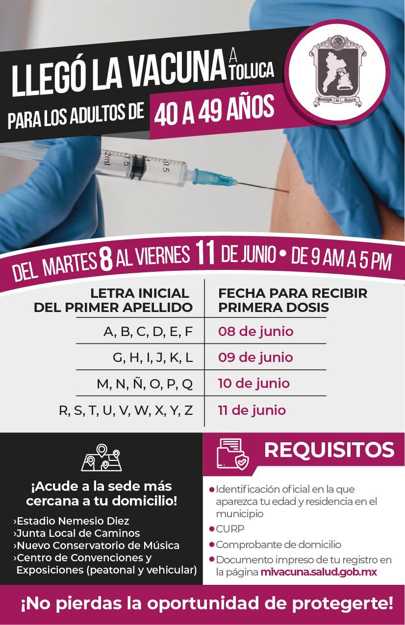 Del 8 al 11 de junio se llevará a cabo en Toluca la Jornada de Vacunación contra COVID-19 para las personas de 40 a 49 años de edad, por lo que deberán acudir de 9:00 a 17:00 horas al módulo más cercano a sus hogares: el Estadio Nemesio Díez, el Nuevo Conservatorio de Música, el Centro de Convenciones y Exposiciones del Boulevard Aeropuerto y en la Junta Local de Caminos.