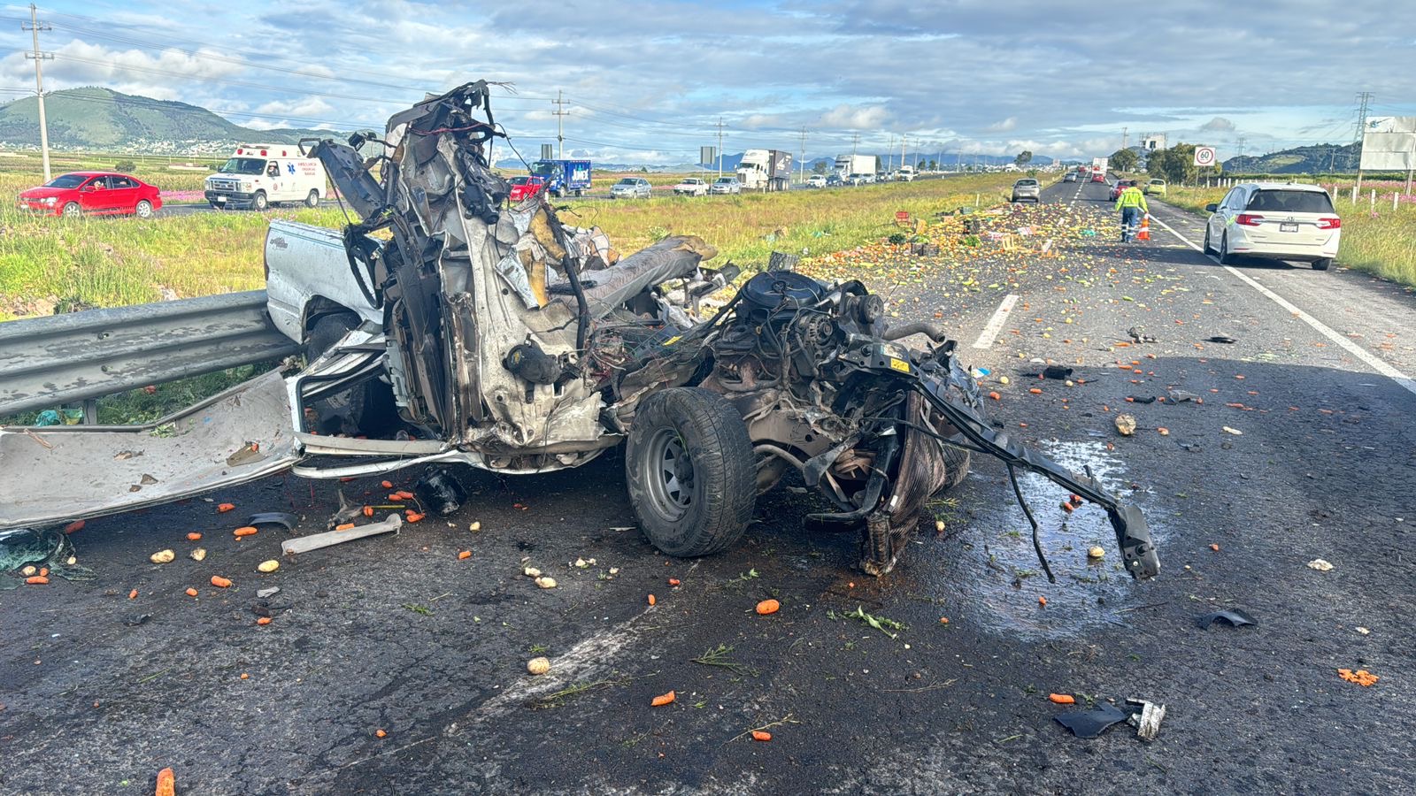 La unidad tipo pick up que transportaba verduras quedó completamente destrozada tras la colisión con la estructura de acero sobre la autopista Toluca Atlacomulco, la mañana del jueves, de acuerdo con los reportes.