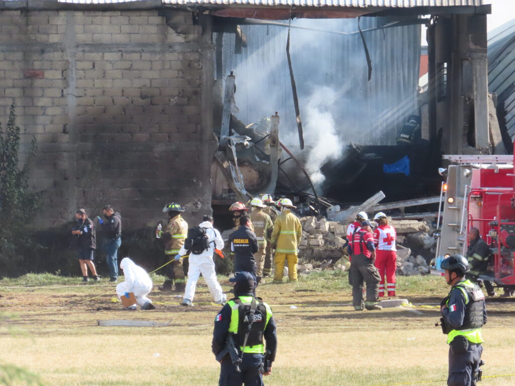 «Se escuchó un golpe muy fuerte, luego vimos el humo y fuego en la bodega», dice un trabajador que observa el área en donde un jet privado en el que viajaba una familia se estrelló en la colonia Reforma en San Mateo Atenco.