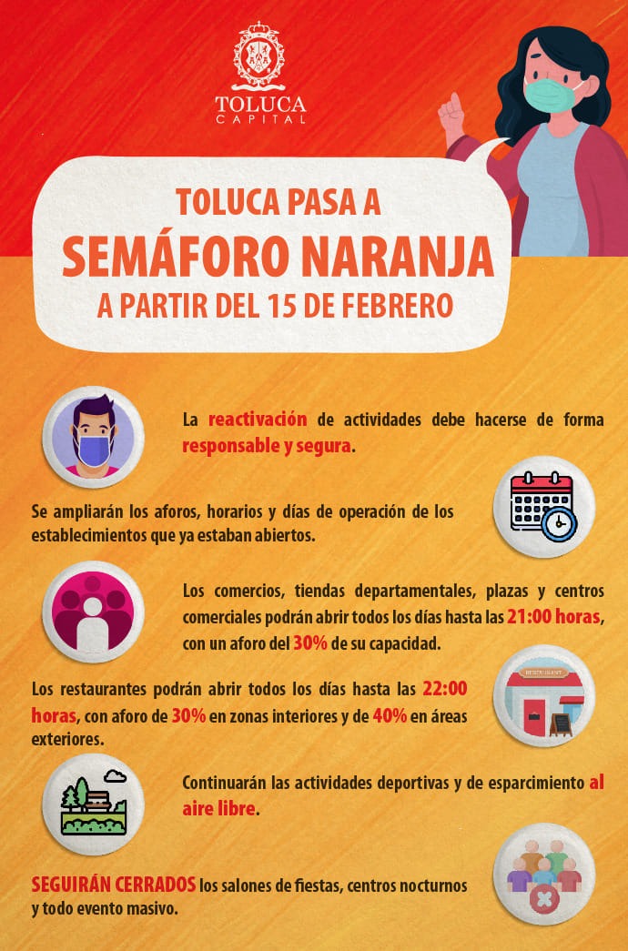 Una vez que Toluca ha pasado a Semáforo Naranja, el gobierno municipal exhorta a la población a no bajar la guardia ante el COVID-19 ya que el riesgo continúa alto, pero si nos cuidamos todos seguiremos juntos y vivos este 2021. Para evitar otro repunte en los contagios, los toluqueños y visitantes de la capital deberán portar cubrebocas de forma correcta –cubriendo nariz, boca y mentón-, mantener la sana distancia de al menos 1.5 metros y practicar el lavado frecuente de manos o usar gel antibacterial. A partir de la presente semana la reactivación de actividades debe hacerse de forma responsable y segura. Se ampliarán los aforos, horarios y días de operación de los establecimientos que ya estaban abiertos. Los comercios, tiendas departamentales, plazas y centros comerciales podrán abrir todos los días hasta las 21:00 horas, con un aforo del 30% de su capacidad. Los restaurantes podrán abrir todos los días hasta las 22:00 horas, con aforo del 30% en zonas interiores y del 40% en áreas exteriores. En tanto, continuarán las actividades deportivas y de esparcimiento al aire libre. En esta etapa del Semáforo Epidemiológico continúan cerrados los salones de fiestas, centros nocturnos y todos los eventos masivos. Se recomienda a la población acudir al médico ante los primeros síntomas, ya que una pronta atención puede hacer la diferencia entre la vida y la muerte; asimismo, se deben redoblar los cuidados con las personas vulnerables como adultos mayores, mujeres embarazadas y enfermos crónicos. De igual forma, el gobierno municipal de Toluca recuerda a la población que a través de la aplicación Detector COVID-19 o de la página web del Ayuntamiento www.toluca.gob.mx, se mantiene un canal abierto de información veraz, actualizada y oportuna; además, pueden realizarse pre diagnósticos para coadyuvar en la identificación de casos potenciales de contagio. Aunado a ello, en caso de necesitar informes o apoyo psicológico, los toluqueños pueden comunicarse a la Línea de Apoyo DIF Toluca al 722 215 2548.