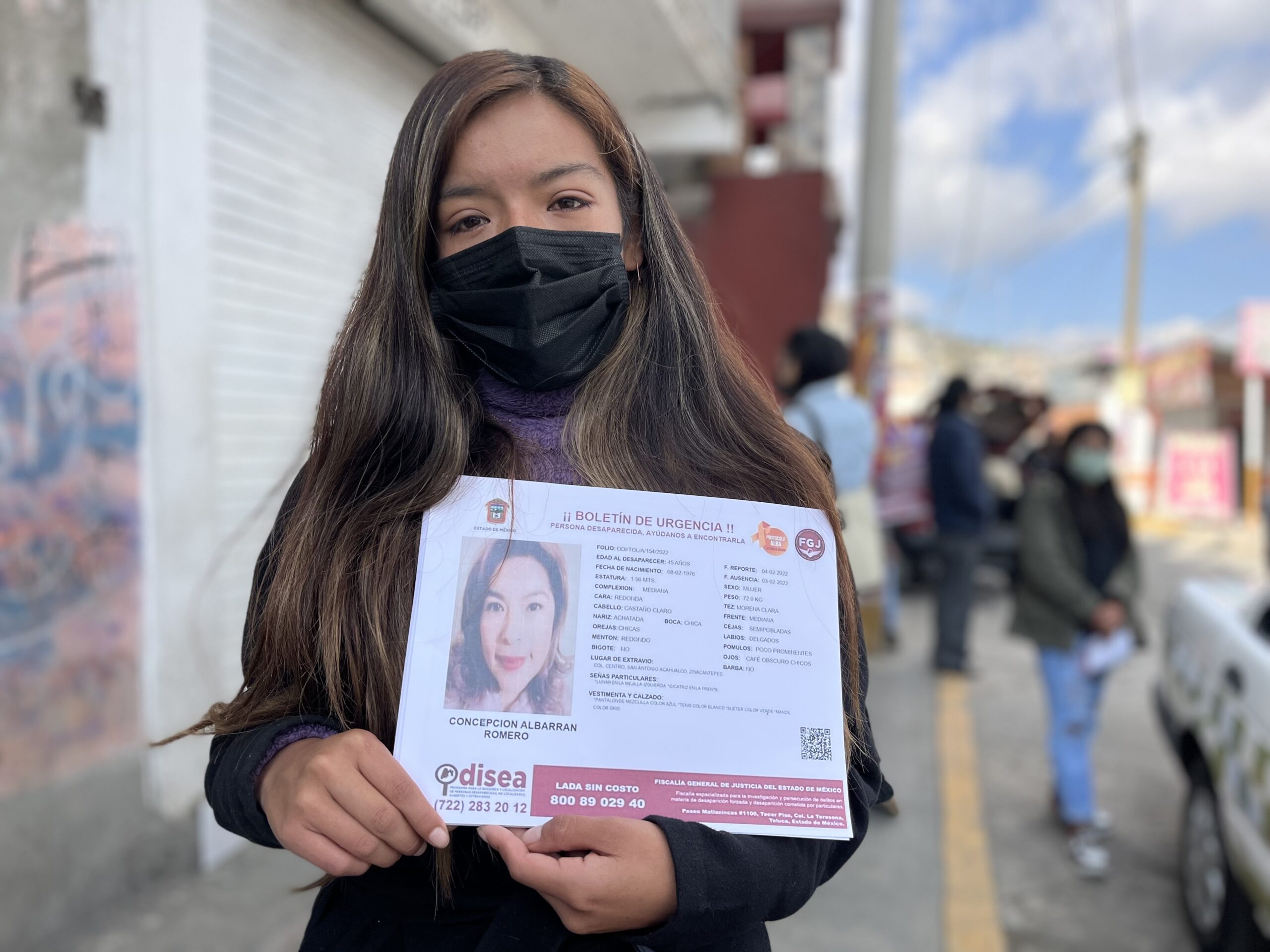 Ella, al igual que su hermana menor llevan cientos de volantes con la ficha odisea de Concepción Albarrán Moreno, trata de no llorar al mostrar la imagen con los datos; sin embargo, lo ojos evidencian la tristeza que la invade.