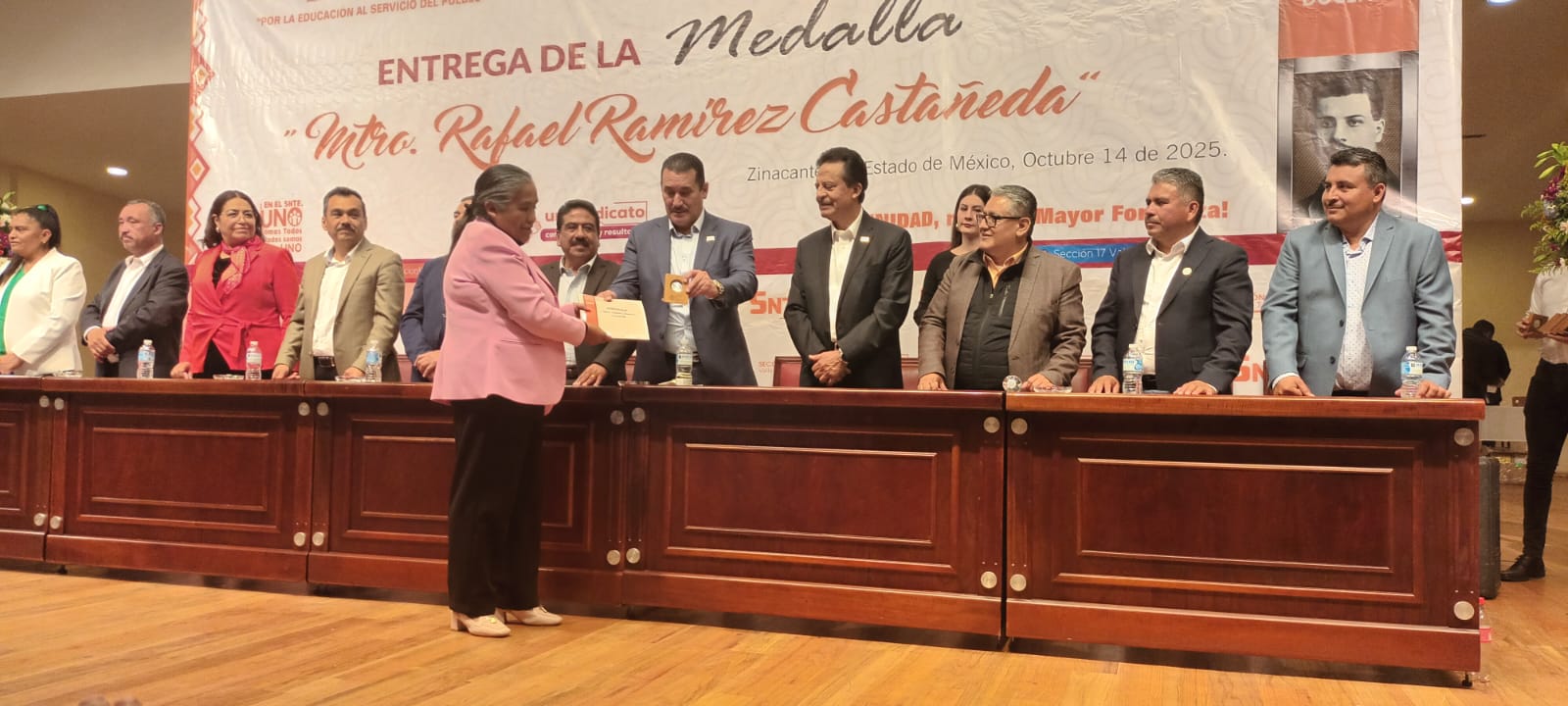 Reconocen a docentes del Sindicato Nacional de Trabajadores de la Educación de la Sección 17 del Valle de Toluca con 30 años de servicios, con estimulos económicos y medalla Rafael Ramírez Castañeda.
