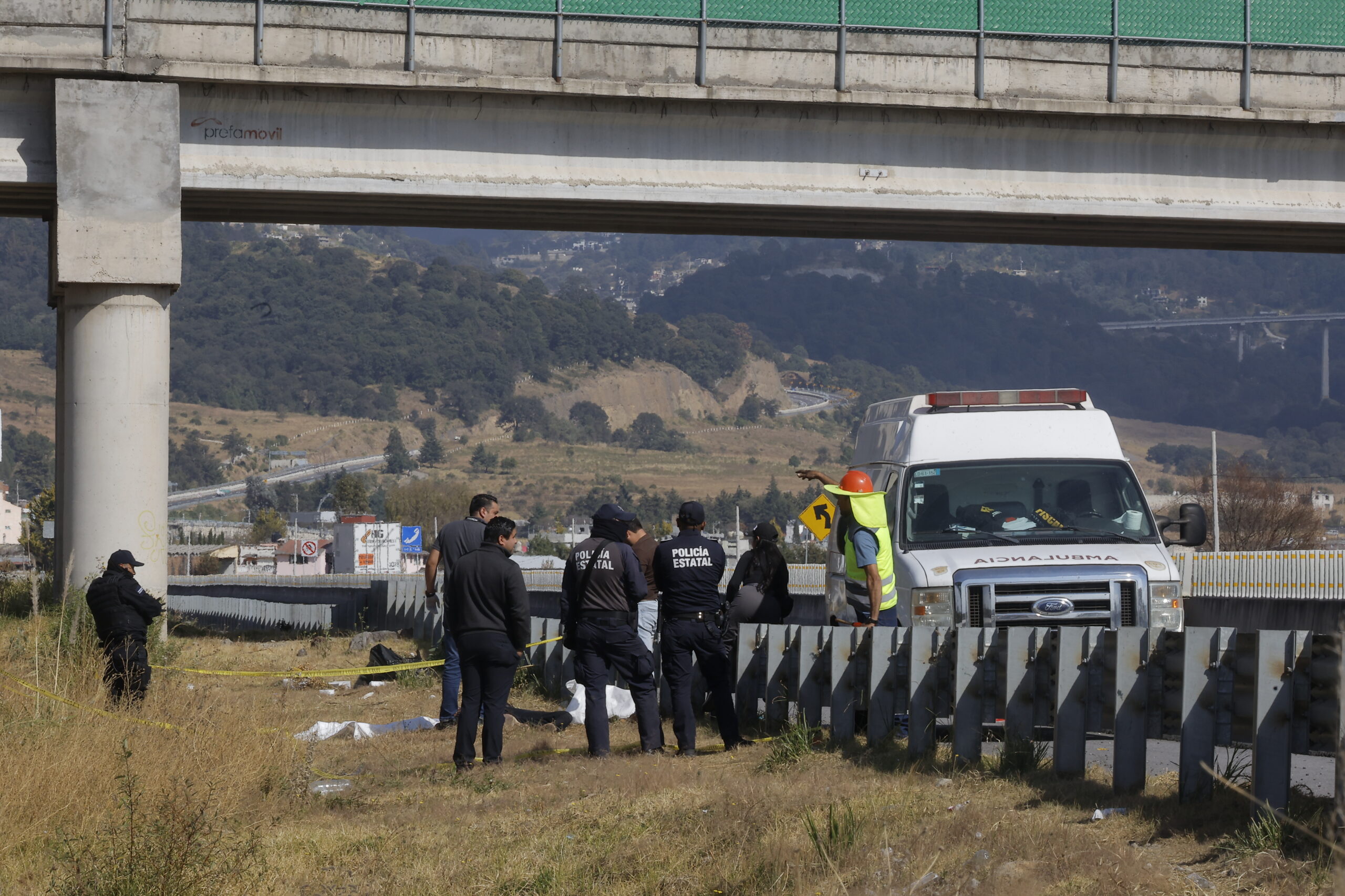 La víctima de unos 50 años, apareció junto a la barra de contención en la vialidad de cuota Toluca Naucalpan en dirección a la capital mexiquense justo frente a un puente vehicular, la mañana del lunes.
