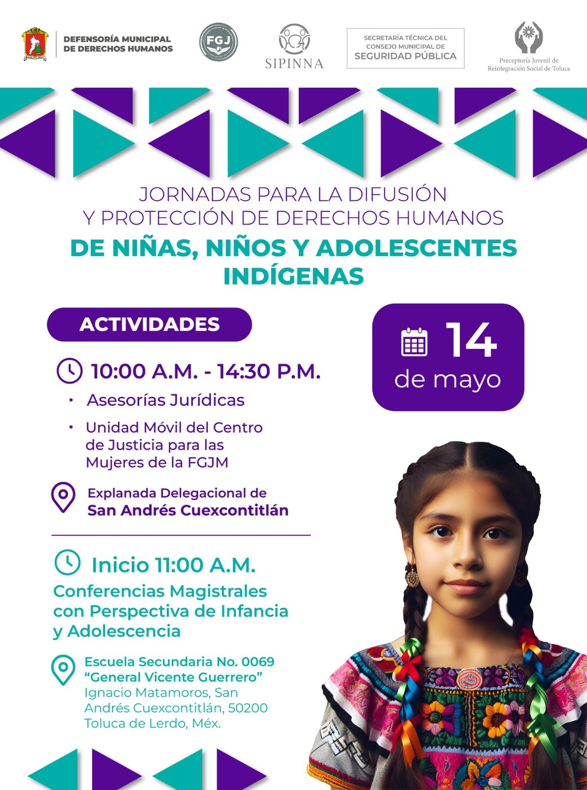 Para garantizar los derechos de los niños y adolescentes indígenas de la capital mexiquense, el Ayuntamiento invita a la población a participar en la Jornada para la Difusión y Protección de Derechos Humanos de este sector de la población, mismo que se llevará a cabo el 14 de mayo, en la explanada delegacional de San Andrés Cuexcontitlá.