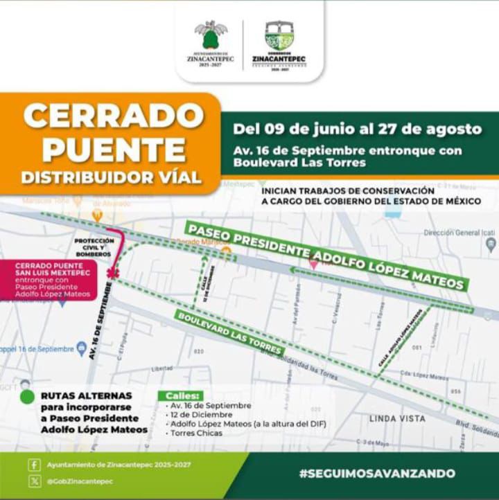 El ayuntamiento de Zinacantepec, dio a conocer que a partir de este lunes 9 de junio y hasta el 27 de agosto, permanecerá cerrada la avenida 16 de septiembre a la circulación en su intersección con avenida Las Torres.