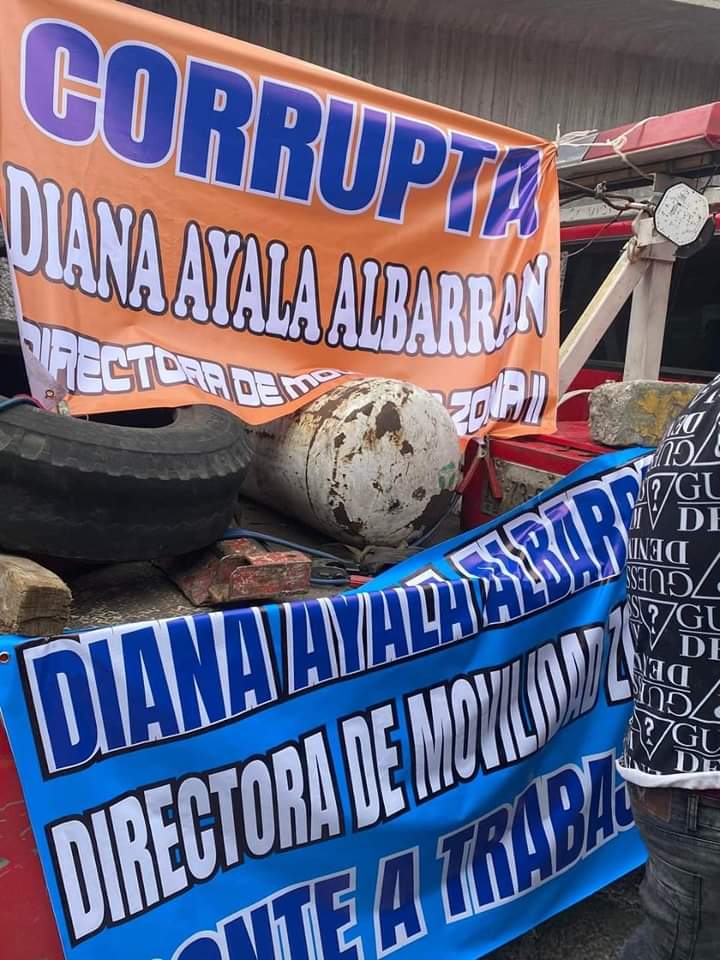 Y un grupo de inconformes, que portaban leyendas de “Soy Transportistas, soy mugroso” y escenificaron escenas de crucifixión, llegaron a las inmediaciones las oficinas de la Secretaría de Movilidad del Estado de México en el municipio de Tlalnepantla, donde exigían la destitución de la Directora de Movilidad Zona II, Diana Ayala Albarrán por ineficiente y colocaron vinilonas que decían “Corrupta Diana Ayala Albarrán Directora de Movilidad Zona II” y “Diana Ayala Albarrán Directora de Movilidad Zona II Ponte a trabajar”.