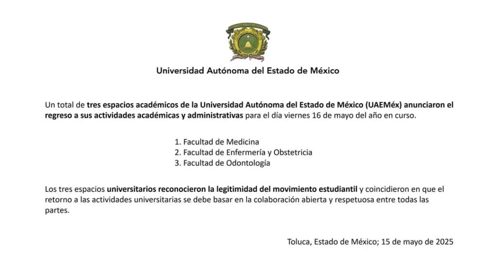 Cabe mencionar que el director de la Facultad de Medicina reconocimiento a los estudiantes por su solidaridad con compañeros de toda la UAEMéx y por su participación en el resguardo de las instalaciones.