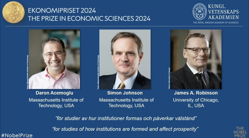 El turco-estadounidense Daron Acemoglu y los británicos-estadounidenses Simon Johnson y Jame A. Robinson fueron galardonados este lunes con el Premio Nobel de Economía por sus investigaciones sobre las instituciones y cómo afectan a la prosperidad de las naciones.