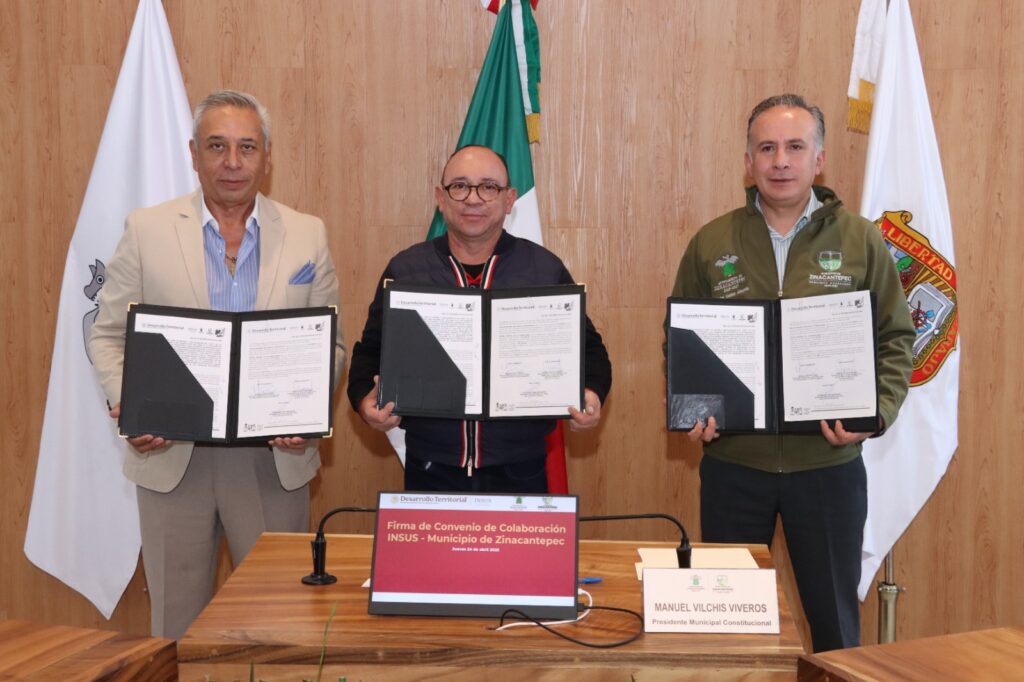 El convenio fue signado por el presidente municipal de Zinacantepec, Manuel Vilchis Viveros, el representante Regional del INSUS en el Estado de México, Luis Miguel Lona Hernández, y el secretario del Ayuntamiento, Gabriel Valdés Albarrán.